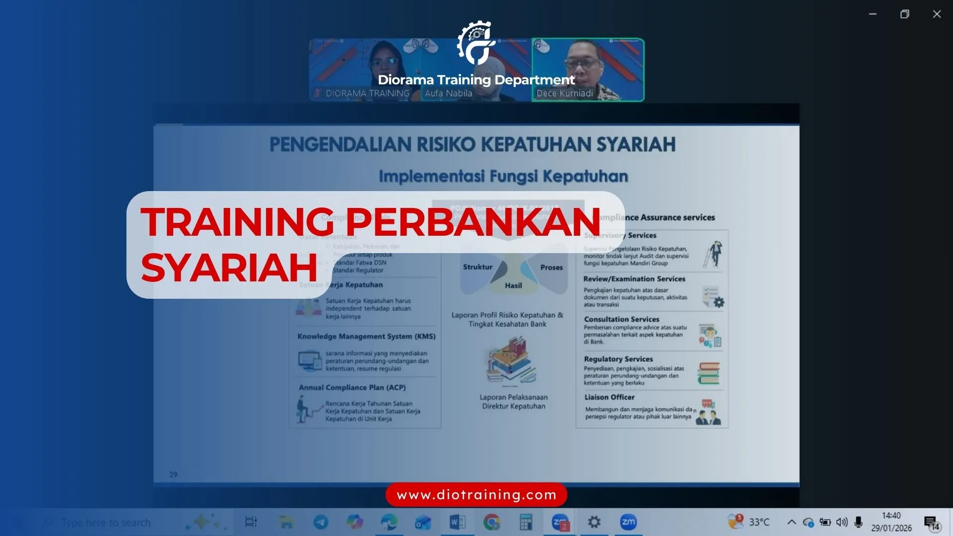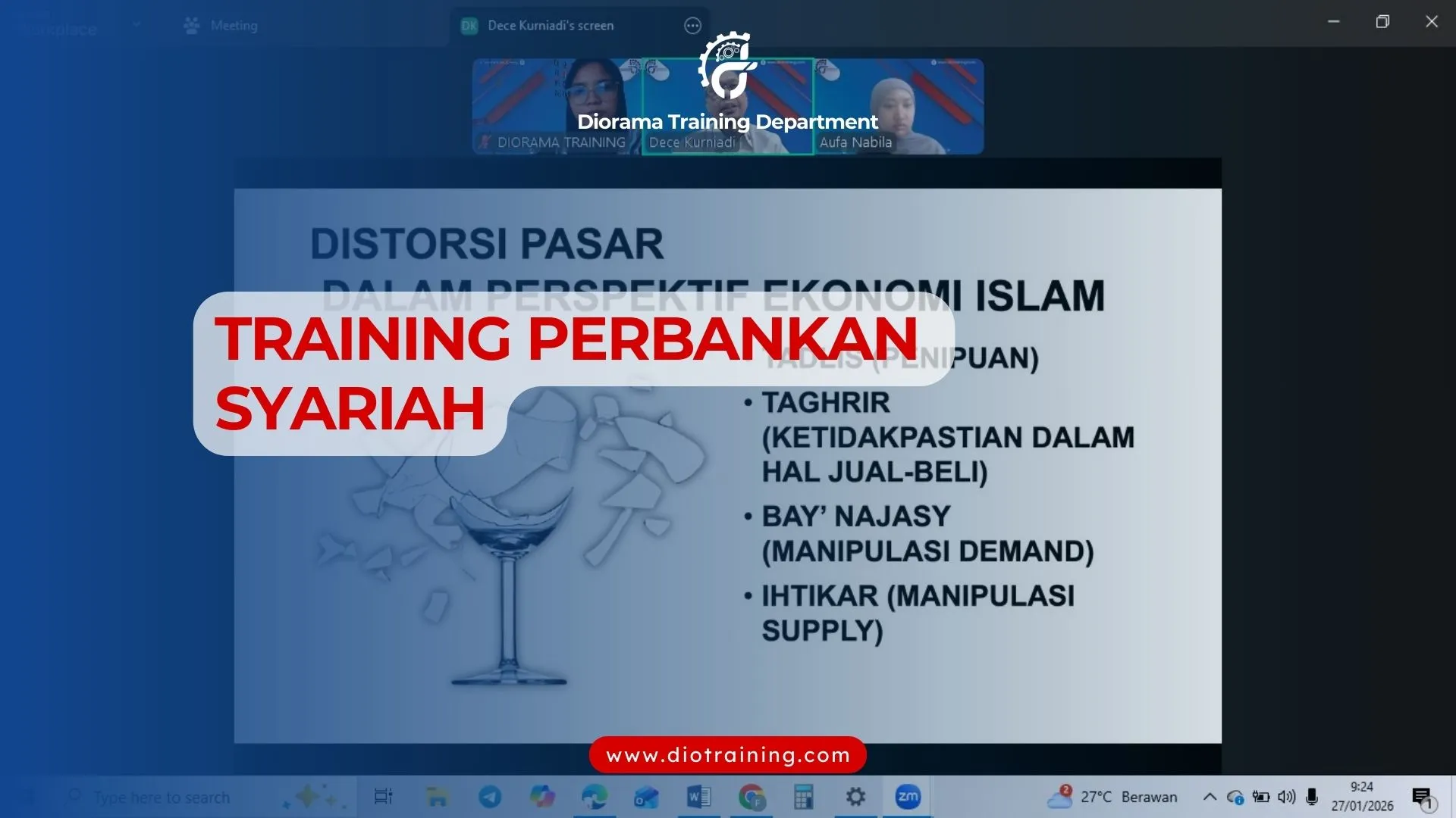 Pada tanggal 27 dan 29 Januari 2026 yang lalu Diorama Training menyelenggarakan Training Perbankan Syariah yang diikuti peserta individu (personal). Training ini berlangsung secara online melalui aplikasi Zoom Meeting, training berjalan lancar dan antusias.